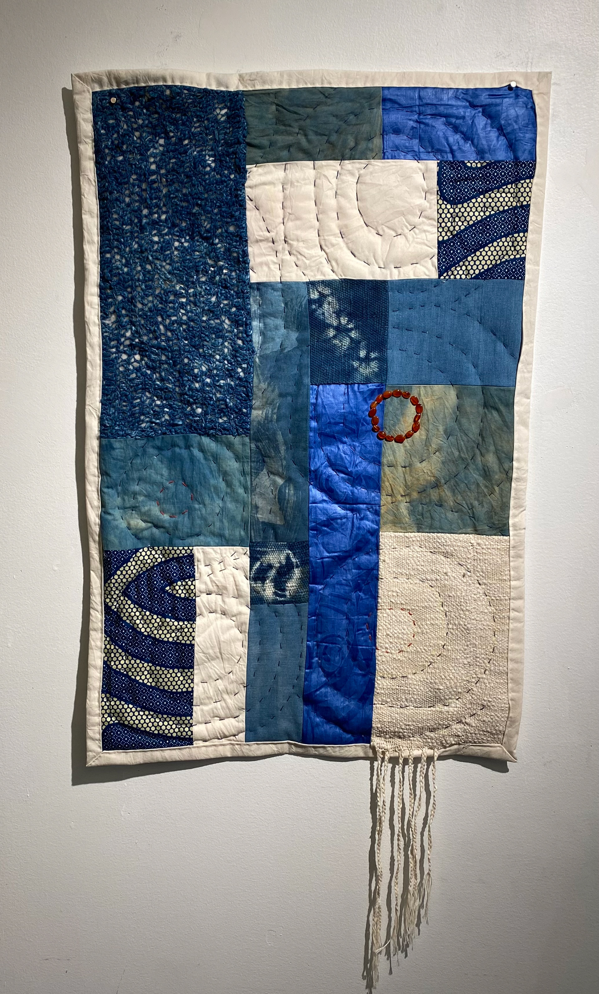 Indigo resist dyed cloth, hand-woven cloth, bazin, cotton cloth, hollandaise fabric, denim, crocheted cloth, embroidery thread, carnelian beads